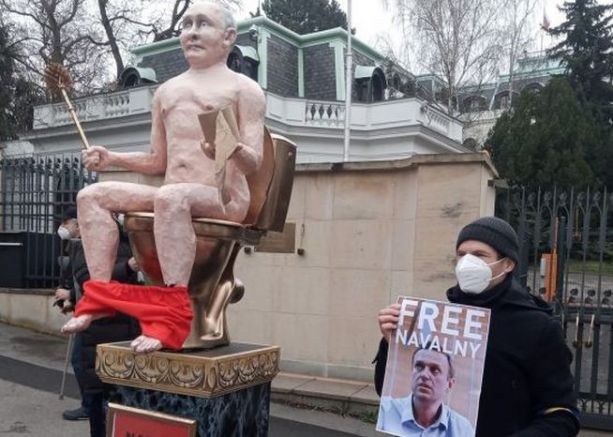 издигна паметник на голия Путин пред руското посолство в Прага,