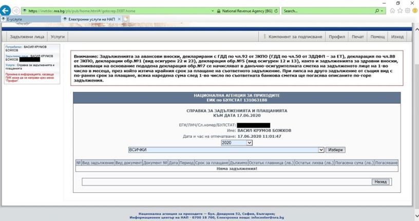 Към 17.06.2020 година не дължа никакви данъци и такси на хазната.
