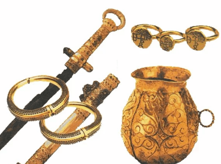 На снимката:Част от съкровището от Малая Перешчепина със златните печати-пръстени на Кубрат